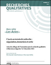 Ce numéro hors-série, codirigé par Elie Saaoud, Linda Rouleau et Maryame Ichiba, rassemble une sélection de douze contributions issues du Colloque d’automne 2023 de l’ARQ, consacré à l’accès au terrain en recherche qualitative. Trop souvent traité comme une simple étape logistique, l’accès au terrain est ici reconsidéré comme un moment central de la production de savoirs, à la fois processuel, performatif et relationnel. Les textes réunis dans ce dossier explorent une diversité de contextes de recherche et mettent en lumière les défis méthodologiques, éthiques et identitaires qui émergent durant le processus d'accès au terrain, de son maintien ou de sa sortie. En croisant témoignages, réflexions théoriques et propositions méthodologiques, ce numéro invite à mieux outiller la communauté de recherche qualitative et à intégrer plus explicitement ces enjeux dans la formation et les pratiques contemporaines.
