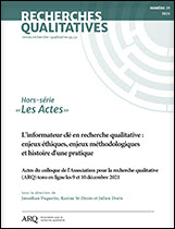 Ce numéro co-dirigé par Jonathan Paquette, Karine Saint-Denis et Julien Doris, propose de faire un bilan sur la question de l’informateur clé en recherche qualitative et découle du Colloque d’automne 2021 de l’Association pour la recherche qualitative. À l’instar du colloque qui l’a précédé, ce numéro spécial entend renouveler les discussions, réflexions et usages de ce concept atemporel et pluridisciplinaire qu’est l’informateur clé. Ce numéro présente ainsi autant d’illustrations de l’importance relationnelle entre chercheurs et informateurs clés. Il vient enfin souligner combien les nombreux défis et questions, tantôt sur le plan éthique, tantôt dans une dimension plus pratique, contribuent ensemble à confirmer cette place de choix de l’informateur clé dans le paysage de la recherche qualitative.